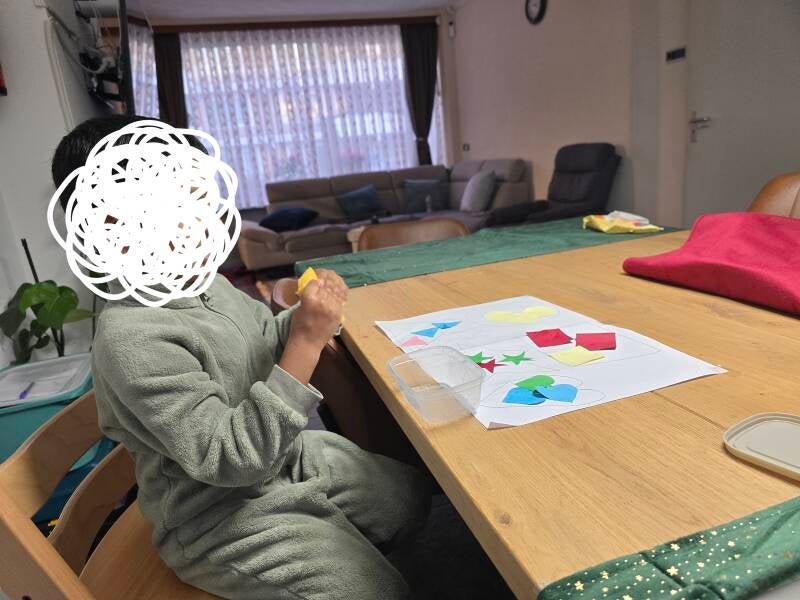 Samen knutselen en experimenteren met lijm, terwijl we op een speelse manier de vormen oefenen